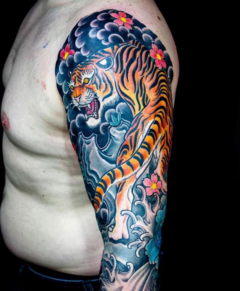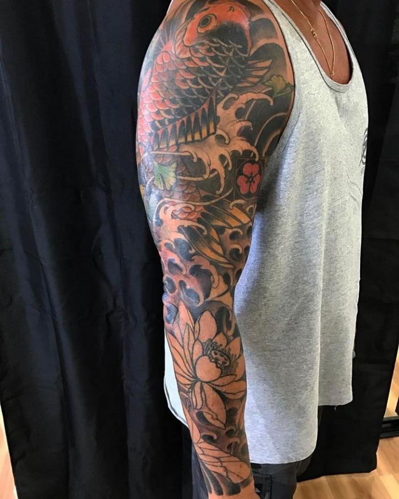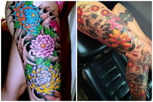 Такие татуировки с разными цветами высоко символичны. Они выполняются в технике «тебори», дополняются другими традиционными для японских тату элементами – птицами, карпом кои, национальными орнаментами. Для рукава чаще всего выбираются яркие, контрастные чернила, с эффектными, броскими красителями.