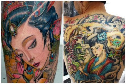 Пользуются популярностью наколки самураев. Их часто изображают с оружием, готовых к бою. Не менее известны и картины с гейшами. Эти восточные красавицы изображаются сидящими в позе лотоса, либо танцующими.