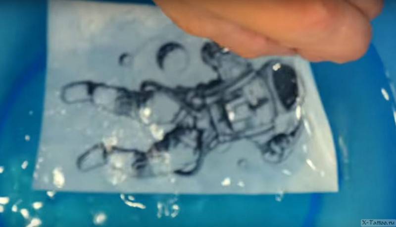 - Окунаем получившуюся переводку в воду на 3 секунды и прижимаем рисунком к нужному месту на теле.