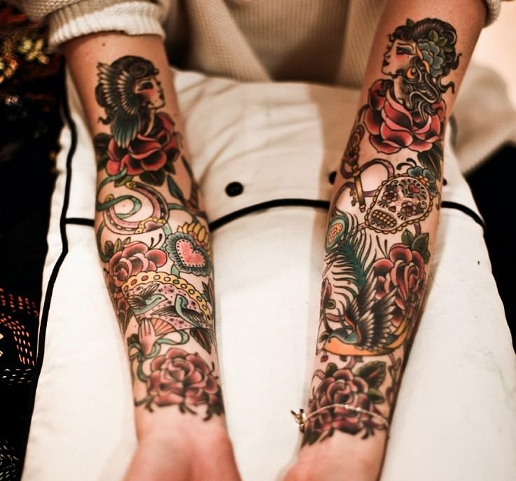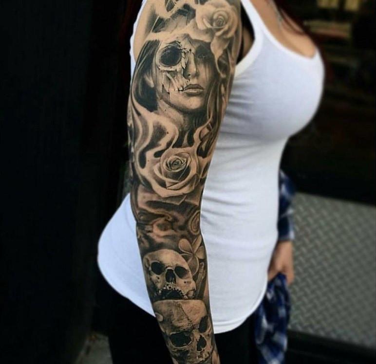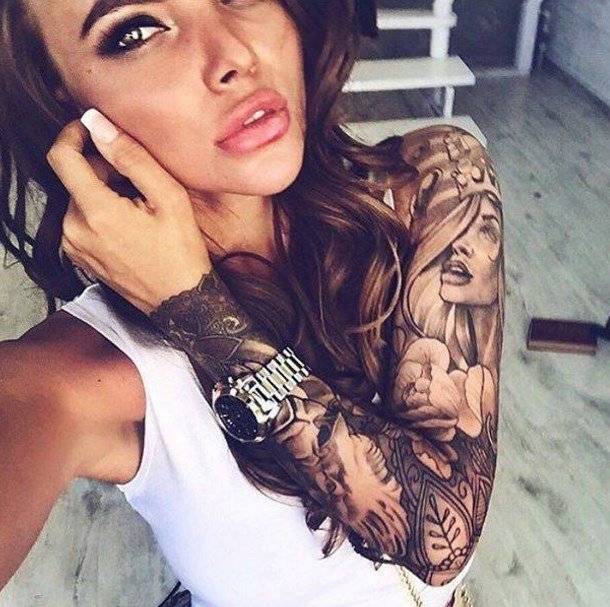 Татуировка рукав – одно из самых трендовых направлений в боди арт. Ее трудно не заметить и еще труднее игнорировать. Не всем удается скрыть свое любопытство при виде девушки с нанесенными от плеча до запястья изображениями цветов, животных или портретов значимых для нее людей. При этом рисунок занимает не менее 95% площади руки. Другими словами, на коже нет свободного места.