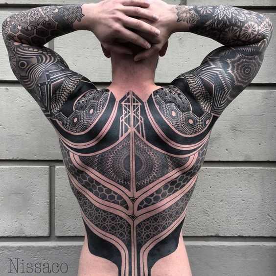 Подобные татуировки рукава для мужчин очень напоминают часть настоящей одежды, так как в темный цвет окрашивается больший участок руки. Как правило, наколки этого направления используют мужчины, если хотят перекрыть старую тату, которая владельцу просто надоела или потеряла собственный первоначальный вид.