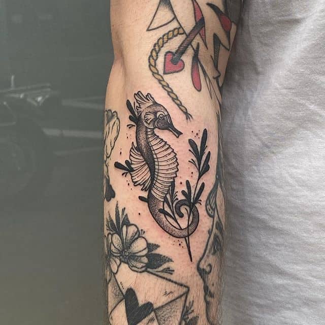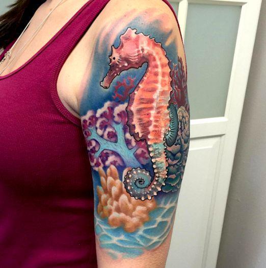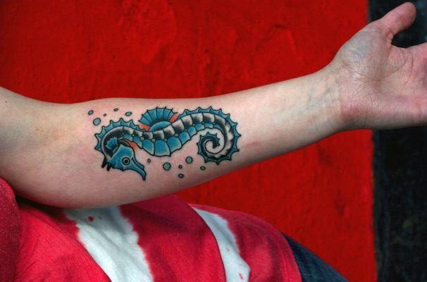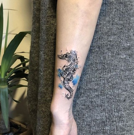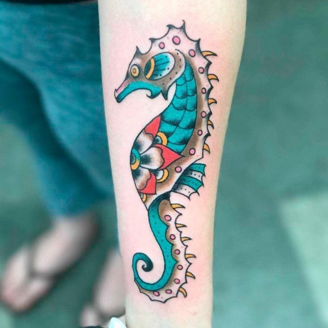 Морской конек — любимец творческих девушек. Он означает спокойствие, терпение, умиротворение. Его глаза могут смотреть в разные стороны, поэтому он является еще и символом бдительности. Очень популярен эскиз в виде двух морских коньков, которые образуют сердце. Такая иллюстрация означает прочную любовь.