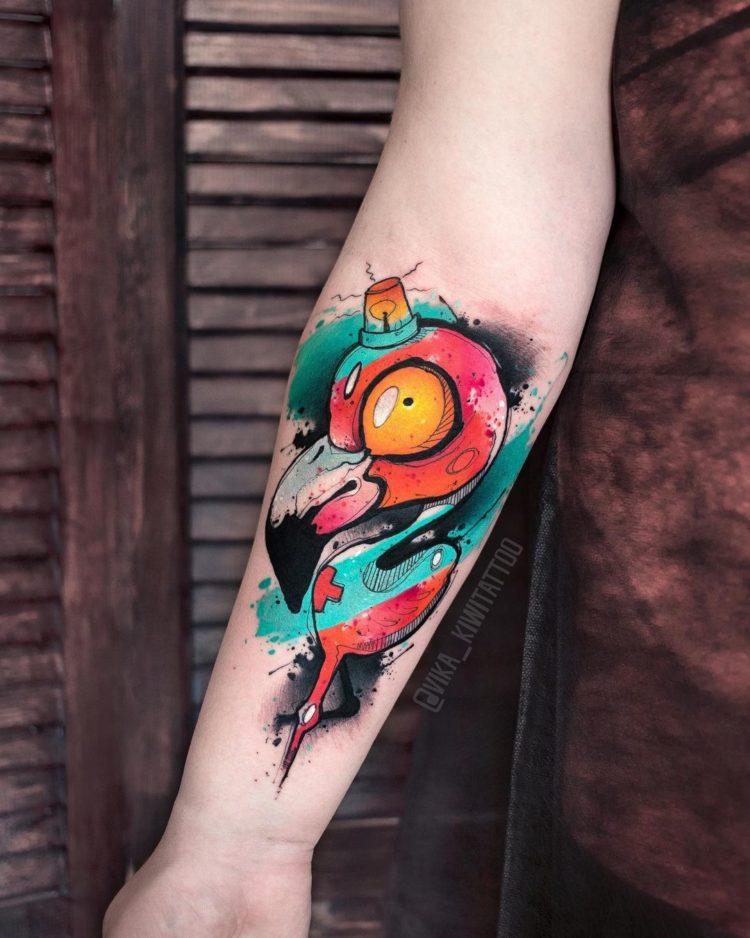 Рисунок во всех подробностях изображает устройство механизма. Шарниры, пружины, шестерни, винты – все это можно встретить на тату этого плана.Цветовые решения могут быть различными.