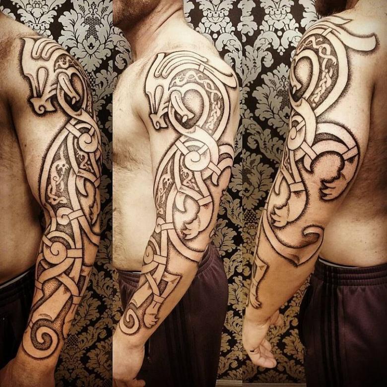 Большому количеству мужчин понравился телесериал «Викинги», и они хотят сопоставить себя с героями картины. Заплетающиеся орнаменты, символы Скандинавии (кельтский крест, руины), звери и птицы(волки, вороны) – все это присутствует на рисунках данной техники.