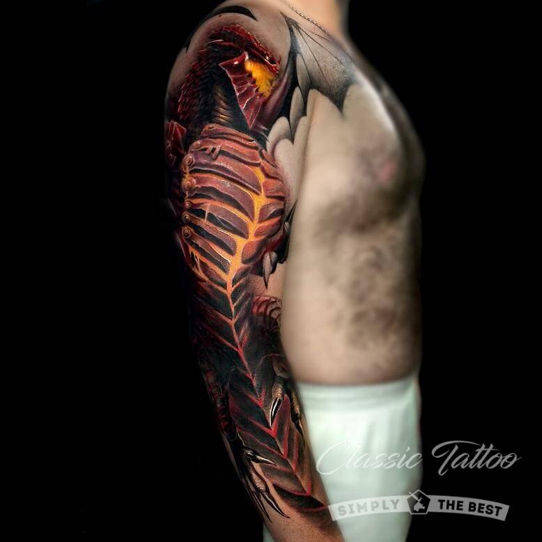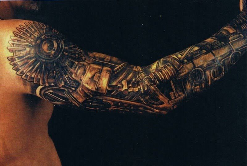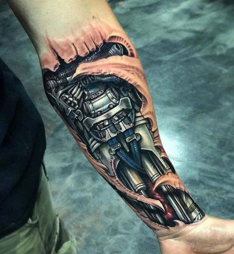 Данный стиль появился сравнительно недавно. Но он уже смог стать востребованным у парней. Суть рисунка тату рукава для мужчины заключается в следующем – показать то, что человек и машина могут быть единым целым, сливаться воедино. Стиль возник после того, как на экраны вышла фантастическая голливудская кинолента с роботами, различными пришельцами в прошлом веке, а именно в середине 80-х годов.
