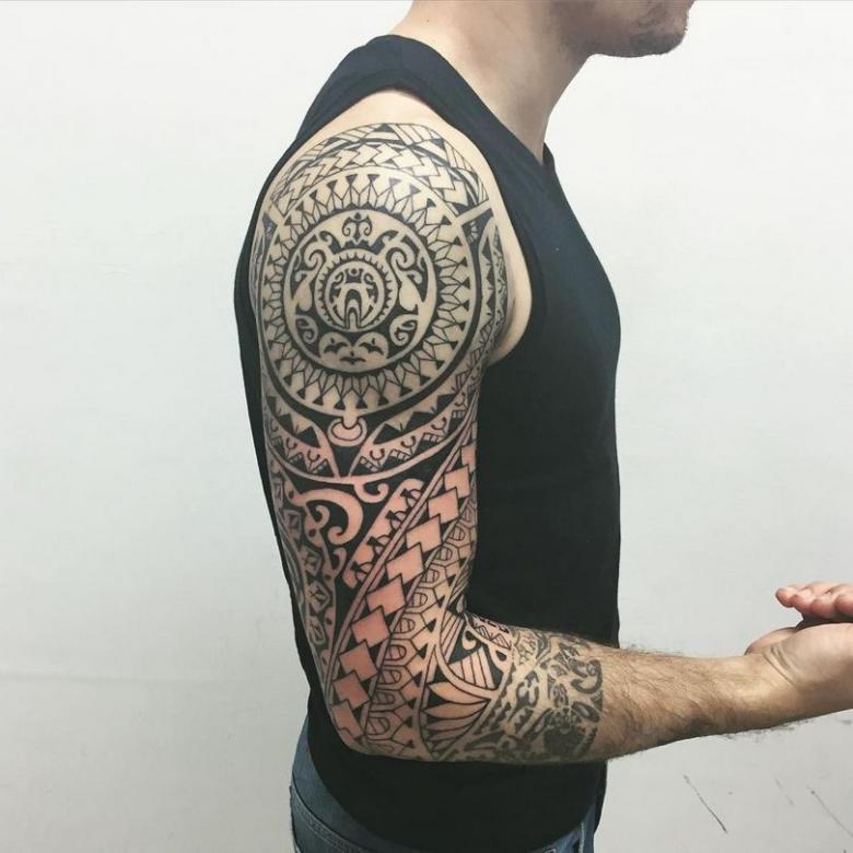Этот стиль тату рукава для мужчины подразумевает наличие племенных орнаментов маори. Они также, как сотни лет назад, являются популярными среди мужчин. Рисунки преимущественно выполняются черной и белой краской. Они имеют стильный вид, поскольку на изображениях переплетаются острые линии, стилизованные изображения разных животных.