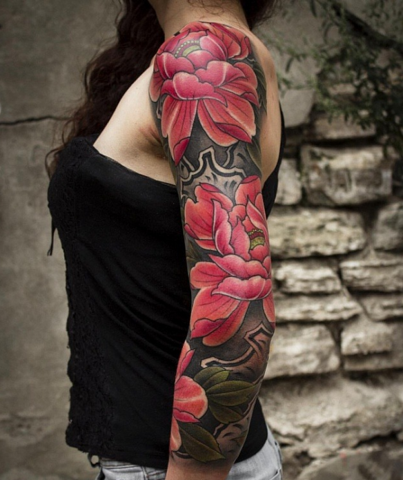 «Рукав» в японском стиле представляет собой рисунок, покрывающий всю руку обладательницы. Татуировка наносится от плеча и продолжается до запястья. Современные эскизы татуировок для женщин практически не имеют отличия от мужских и набиваются по тем же сюжетам и в таком же стиле.
