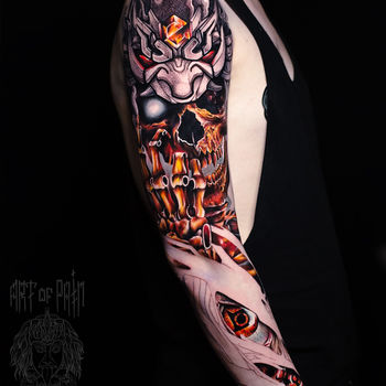 | Полноценный удлинённый рукав | Татуировка наносится на всю поверхность целиком, проходит от плеча и заканчивается на запястье. Также, она может быть продлена до пальцев рук или проходить по внутренней стороне руки. |