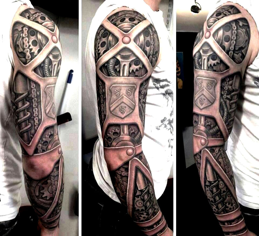 Данный стиль появился сравнительно недавно. Но он уже смог стать востребованным у парней. Суть рисунка тату рукава для мужчины заключается в следующем – показать то, что человек и машина могут быть единым целым, сливаться воедино. Стиль возник после того, как на экраны вышла фантастическая голливудская кинолента с роботами, различными пришельцами в прошлом веке, а именно в середине 80-х годов.