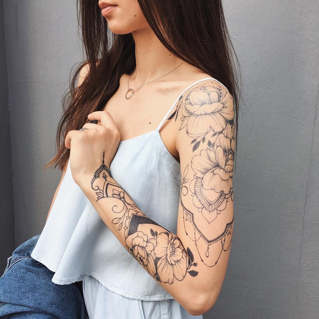 Татуировка рукав – одно из самых трендовых направлений в боди арт. Ее трудно не заметить и еще труднее игнорировать. Не всем удается скрыть свое любопытство при виде девушки с нанесенными от плеча до запястья изображениями цветов, животных или портретов значимых для нее людей. При этом рисунок занимает не менее 95% площади руки. Другими словами, на коже нет свободного места.