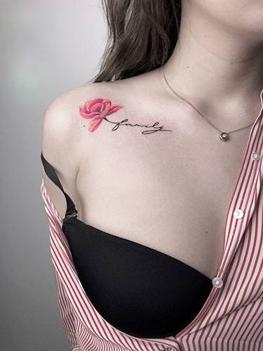 - размер татуировки (если изображение планируется размещать горизонтально по всей длине ключицы, набиваемые слова должны быть крупными, легко читаемыми даже на расстоянии. Если текст предполагается сделать элементом целостной композиции, то наиболее уместным в таком случае будет шрифт маленького или среднего размера);