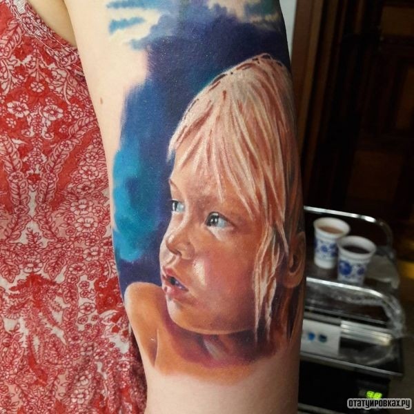Запечатлеть образ самого дорогого человека на память естественное желание каждого. А детки вырастают быстро, и хочется запечатлеть именно очаровательные и умилительные детские черты. Татуировка в честь своих детей может иметь вид надписи с именем или датой рождения, детский рисунок, некая символичная картинка или натуралистичное изображение ребёнка, портрет с фотографии.