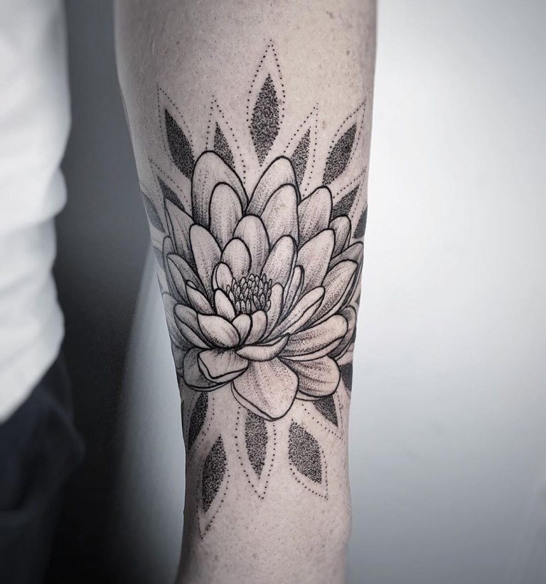 В татуировках дотворк часто встречается изображение лотоса. В основном этот цветок выполняется в стиле геометрия, реализм или орнамент. Основное значение лотоса – это мощь, божественное проведение, неприступность и сила. Сакура символизирует быстротечность и хрупкость жизни.