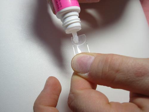 внутренний нижний край типсы смажьте гелем тонким слоем, быстро приложите на свободный край так, чтобы пластик не заходил на кожу, а сам ноготь не был чрезмерно приподнят вверх или опущен книзу;