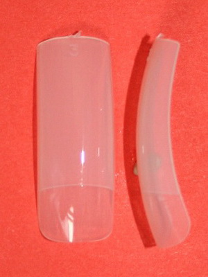 Существуют типсы, разделенные изнутри пополам. Одна часть более тонкая, другая — более толстая. Часть тоньше называется поверхностью наложения, именно ее наклеивают на ногтевую пластину. Более толстая часть является основной частью типса и выполняет функцию свободного края ногтя.