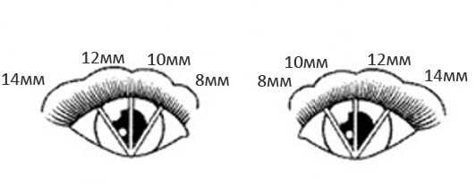 Горизонтальное расположение глаз. Берем длину глаза и вставляем в пространство между внутренними углами, правого и левого.