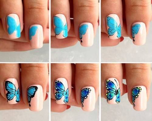 В маникюре есть множество различных вариаций бабочек, вид сверху на 4 крыла, вид сбоку на 2 крыла, крылья бабочки на соседних ногтях и т.п. Для создания бабочки на вашем ногте кистью: