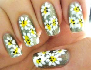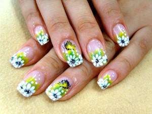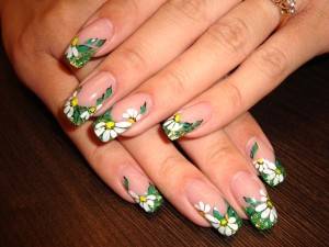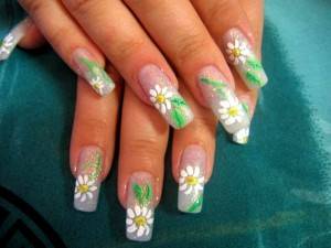 Роспись ногтей акриловыми красками, как видно по фото, часто несет в себе цветочные и романтические мотивы. Наиболее простой вариант это рисунок ромашек. Нужно просто поставить желтую точку и несколькими мазками тонкой кистью изобразить белые лепестки. Если данный узор вы хорошо освоили, то можно переходить к выполнению более сложного узора. Ниже описано, как нарисовать более сложные цветы на ногтях акриловыми красками пошагово.