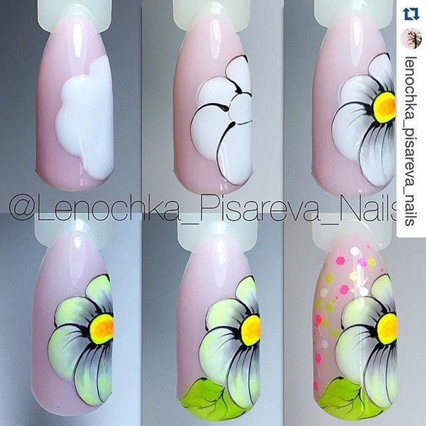 Начинающие рукодельницы могут начать с самого простого варианта — с ромашки. Посередине ставится желтая точка и вокруг нее прорисовываются белые лепестки. Вот и все — симпатичный маникюр с рисунком готов!