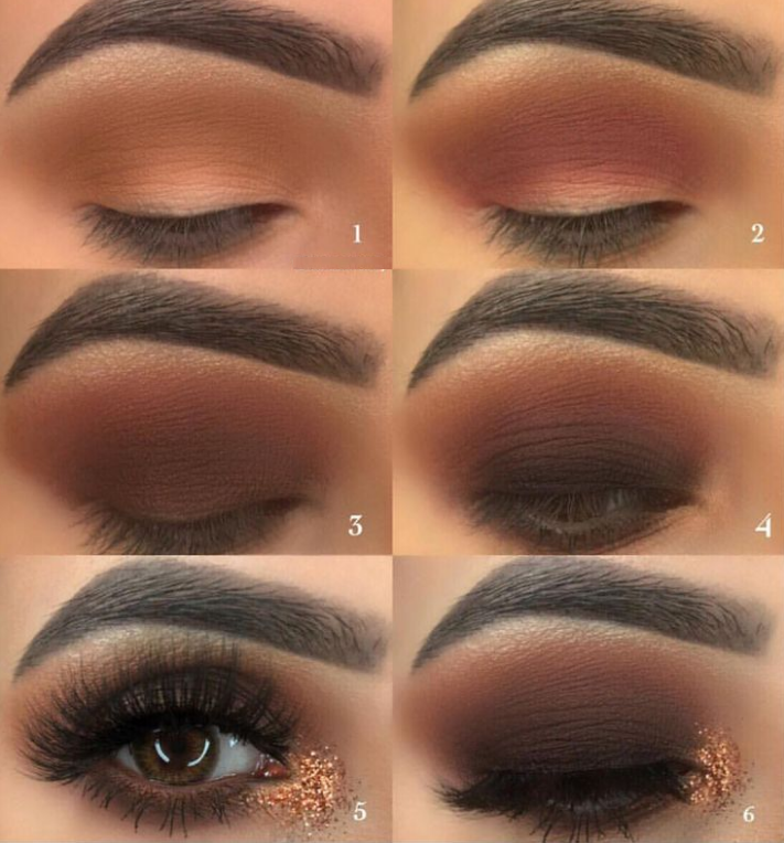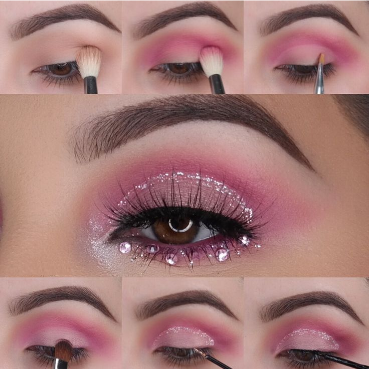 Чтобы освоить азы, стоит брать за основу технику нанесения дневного мейкапа. При этом использовать более яркие тени с блёстками и подводки контрастными карандашами. При нанесении декора на веки, для начала, всё же лучше ограничиться одним цветом, но с двумя-тремя тонами.