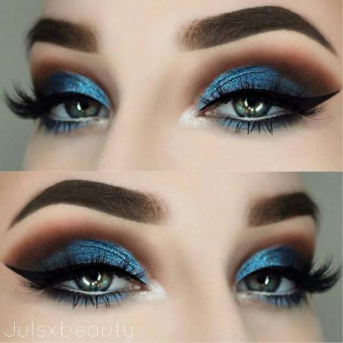 Карандаш для заполнения межресничного пространства может быть не чёрным, а цветным и желательно с блёстками, тогда можно добиться праздничного эффекта. Не стоит забывать о красивой форме бровей, которые могут быть чуть темнее, чем при дневном макияже. Завершит образ яркая помада с блеском или матовый сочный вариант.