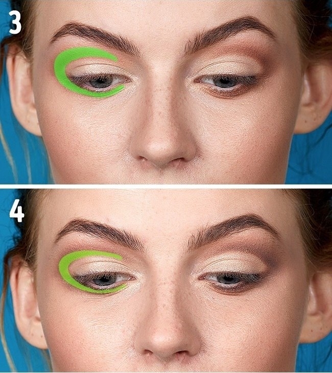 - Оттенком чуть темнее кожи закрасьте орбитальную складку и пространство над ней.