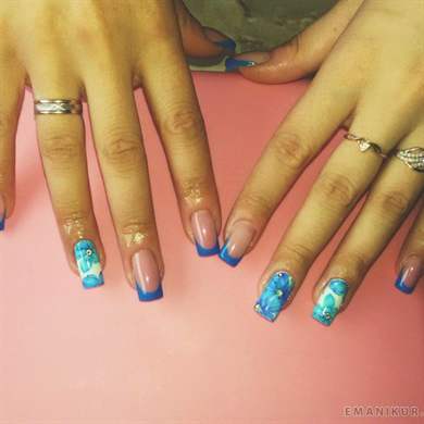 Как только основная техника будет изучена, можно попробовать сделать маникюр с различными вариантами (мраморный, с использованием страз, различных блесток, с применением маникюрных полосок) с помощью современных материалов и подсказок в Интернете, научиться этому сможет даже новичок.