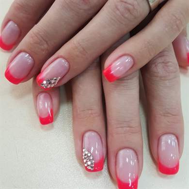- Затем сверху ноготь покрывается слоем геля, начиная от стрессовой зоны. Нужно положить капельку геля, дать ему немного растечься и распределить по поверхности ногтя, чуть-чуть отступая от ногтевых валиков. Немного по-другому обстоят дела, если вы наращиваете френч. Такая технология осуществляется иным способом
