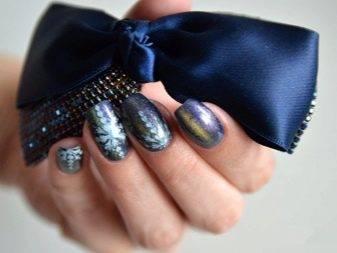 - Декоративный песок, кружева, наклейки, микробисер, стразы, блёстки, фигурки – словом, всё, что можно приклеить. Песком создаются причудливые завихрения, волны, звёздные галактики, блёстки подарят искристое мерцание. Нежно и необычно выглядит кружево на лаках пастельных тонов с матовым покрытием – это отличная идея для свадьбы. Ну, а вариант со стразами и «глазом» – самый распространённый. Стразы могут выступать как самостоятельный элемент, так и как элемент композиции – например, стразом можно обозначить росинку или сердцевину цветка. То же можно сказать и о фигурках. Отдельно или вместе с песком и блёстками стразики красиво обрамляют по краям ногтевую поверхность.