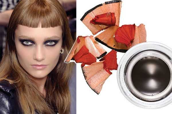 - У нас получился размытый smoky eyes. Чтобы из него получился макияж кошачий взгляд, надо добавить четкости. Берем карандаш и рисуем стрелку по верхнему веку прямо поверх теней. Разумеется, ниже стрелки не должно лежать темных теней. Линия должна ограничивать их;
