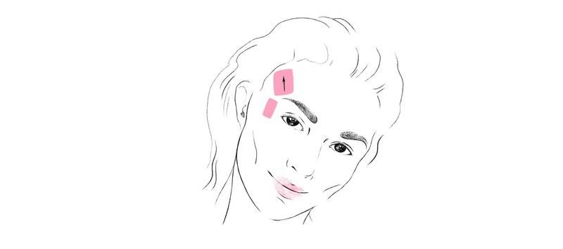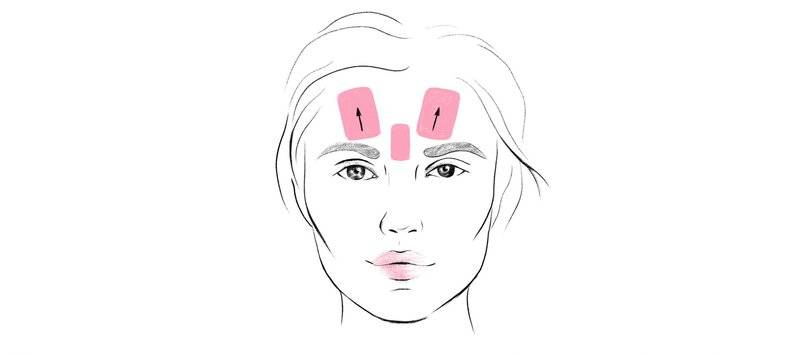Чтобы разгладить морщины на лбу, нужно отрезать от рулона два пластыря шириной 5 см. Каждый приклейте над бровью, предварительно натягивая кожу. Когда тейп будет зафиксирован, он соберется в гармошку. Это означает, что все выполнено правильно.