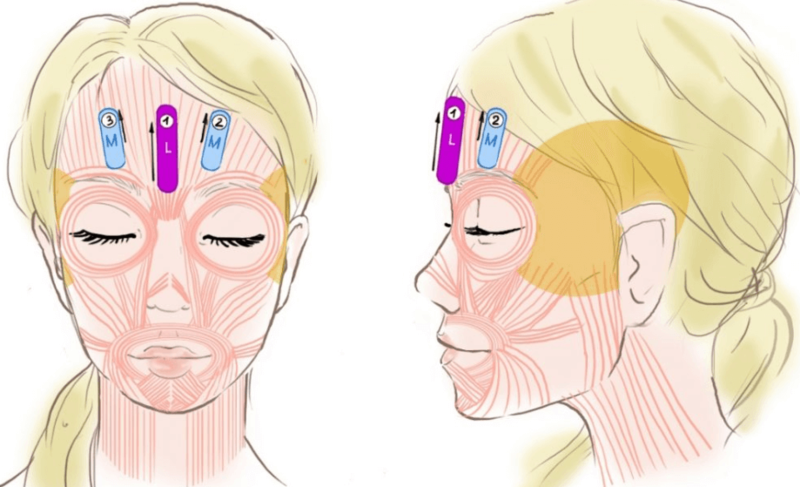 Разглаживание поперечных морщин на лбу начинаем с разволокнения лобной мышцы. Для этого прикладываем ладошки ко лбу и двигаем кожу относительно лобной кости по направлению вниз-вверх. Затем меняем направление, и двигаем кожу вправо-влево.