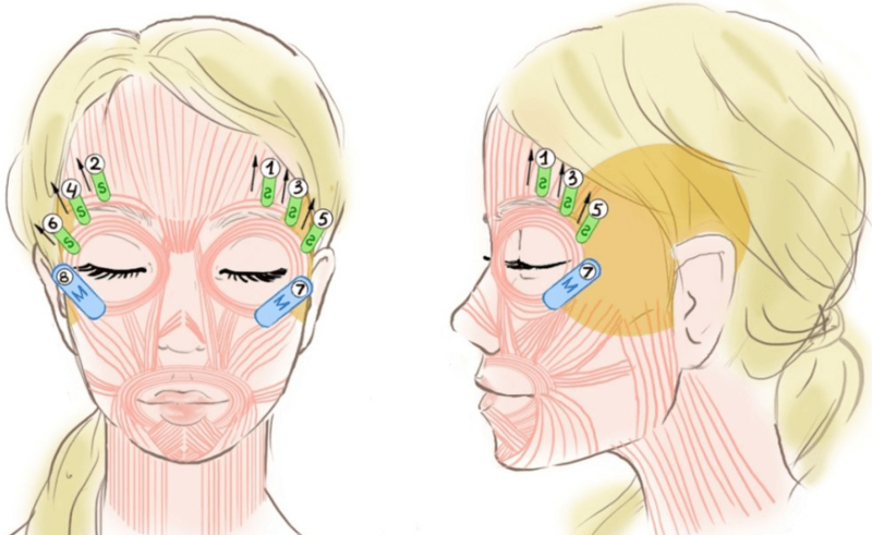 С помощью такого массажа устраняется мышечный спазм в тех местах, где образуются заломы кожи, то есть мимические морщины. Теперь остается зафиксировать результат тейпами.