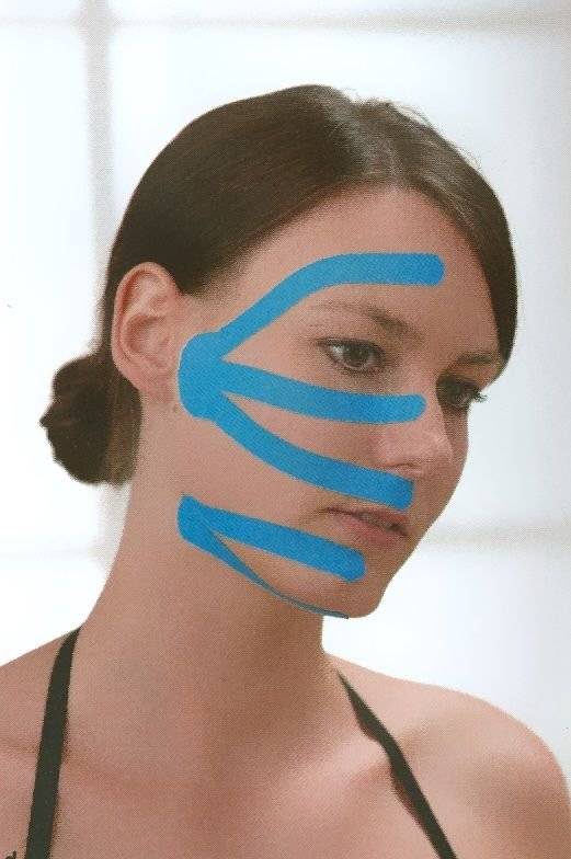 Довольно частая проблема, с которой сталкиваются женщины после 35 лет — оплывший овал лица. Чтобы восстановить форму или предотвратить такие изменения, можно использовать тейпы. Понадобится пластырь шириной 2,5 см и длиной равной расстоянию от уха до уха по линии подбородка. Тейп клеят от центра к ушам, кожу подтягивают вверх.