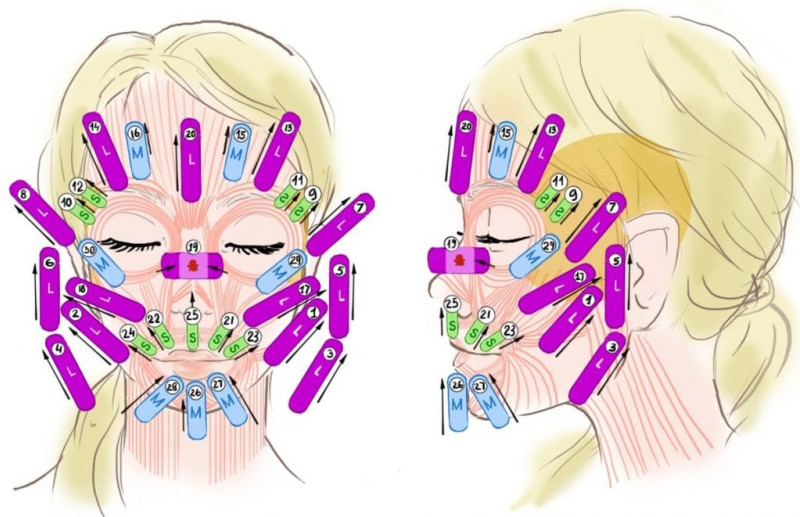 Вариантов тейпирования лица существует множество. К примеру, вот схема одного из способов тейпирования лица в целях устранения морщин.