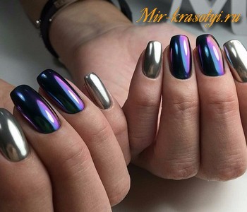 Вариант пудры, которая втирается в пластину без липкого топа. Результат — зеркальные переливы с переходами оттенков. Особенно эффектно такой дизайн смотрится на темной базе. Эффектно на такой зеркальной поверхности смотрится и капельный дизайн.