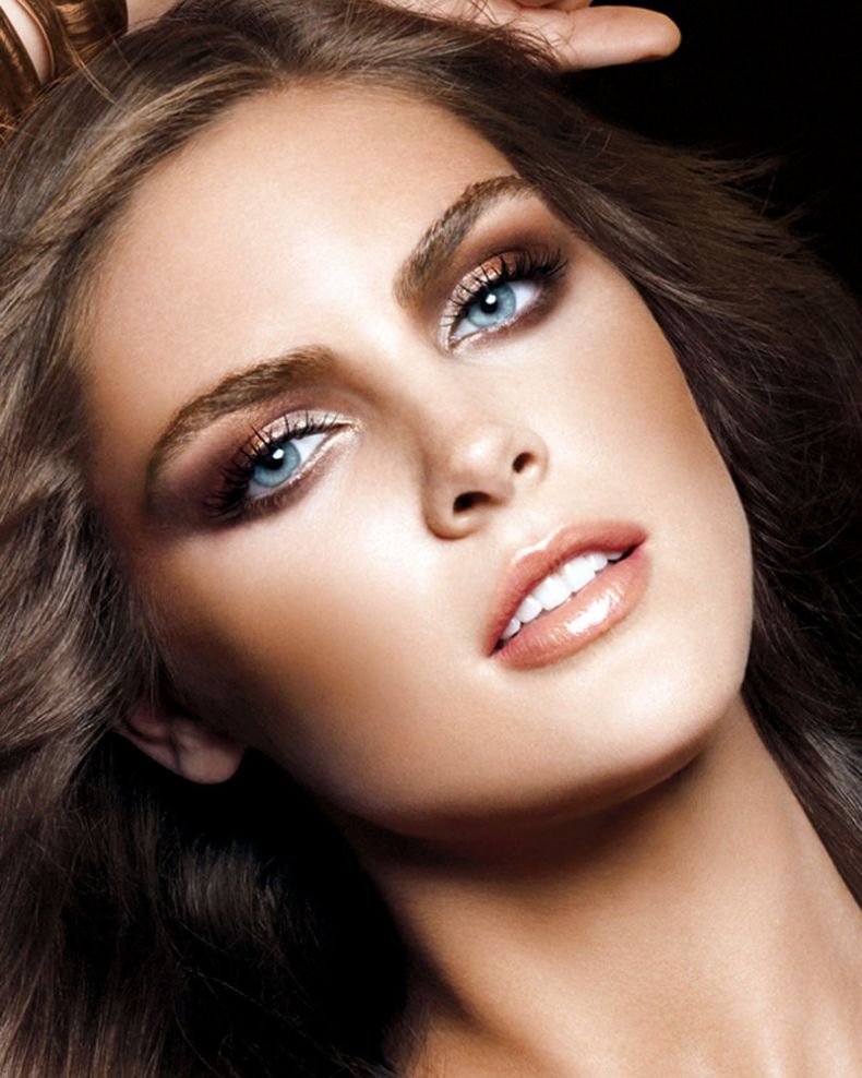 Австралийская супермодель обладает лицом в стиле бэбифейс, которому противопоказан макияж с темными контрастными оттенками и резкими линиями подводки. Ее голубым миндалевидным глазам и натуральными каштановым волосам прекрасно подходит макияж с естественными коричневыми тенями.