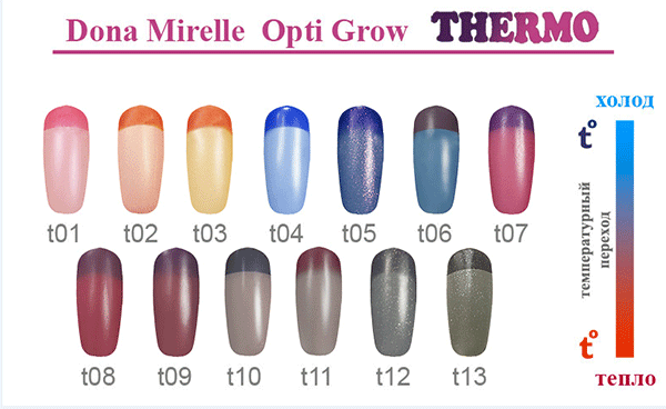 Около 50 термических гелей-лаков с яркими оттенками и самыми разнообразными сочетаниями. Посмотреть, как меняют цвет гели-лаки этого производителя в зависимости от температуры, можно в видеообзоре: