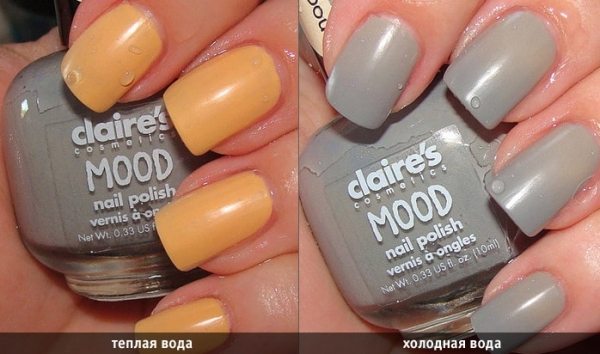 Чтобы оценить эффект, нужно применить продукт по назначению и подвергнуть руки температурному воздействию. Например, направить на пальцы теплый или холодный воздух из кондиционера, выйти на улицу или опустить руки в воду разной температуры. Тогда можно будет оценить скорость, красоту, все тонкости и вариации изменения цвета.