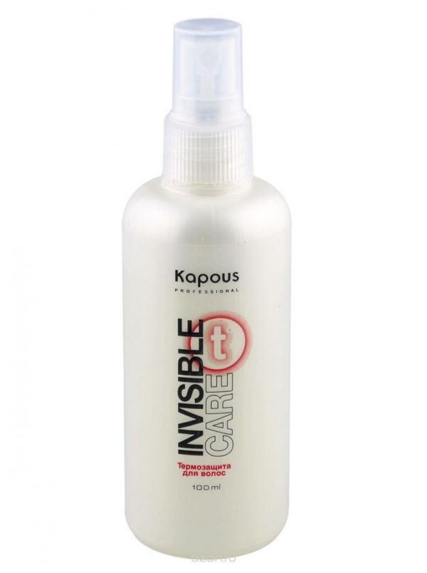 - KAPOUS INVISIBLE CARE выпускается в виде несмываемого спрея. Формула обогащена гидролизованными протеинами пшеницы, шелковичными протеинами, восстанавливающими липидный баланс кожи головы. Пленка защищает окрашенные пряди от выцветания, делает их мягкими и упругими. Средство Капус имеет легкий фиксирующий и антистатический эффект, легкий цветочный запах. Возможно ежедневное применение для горячих укладок.