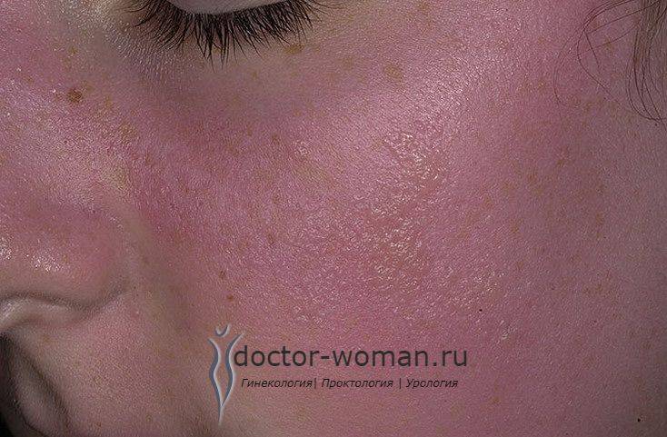 Кожа характеризуется неравномерным цветом и сильным жирным блеском.