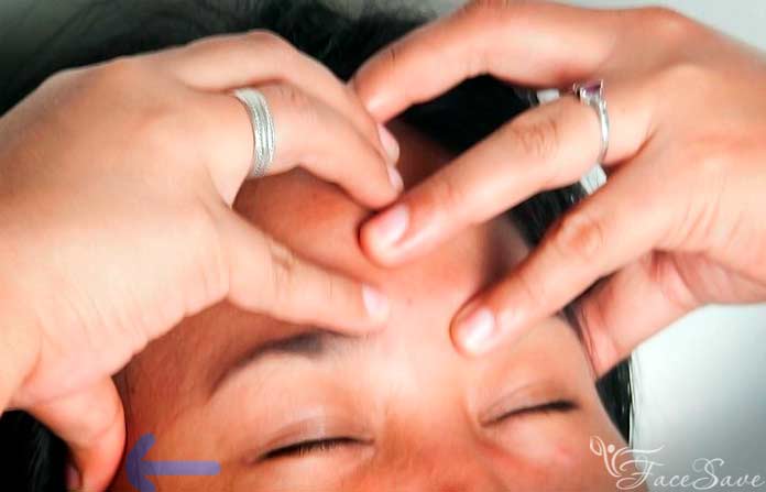 Положите большие пальцы на виски (почувствуйте вдавления). Двумя пальцами обеих рук (указательным и средним) выполните плавные движения от точки над переносицей вверх параллельно бровям к височным зонам;