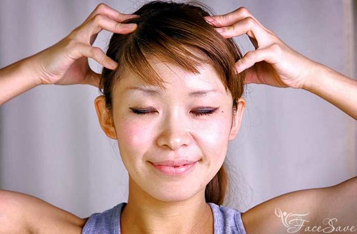 Плавно промассировать указательными пальцами ото лба к вискам. Положить большие пальцы на виски, а указательные — на изгибы бровей