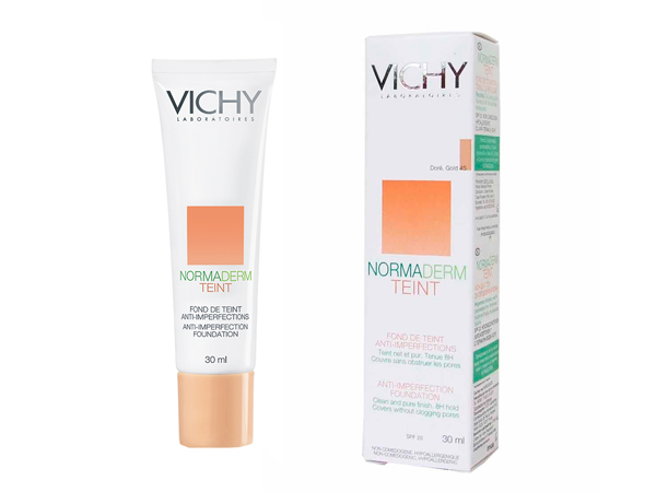 Vichy Normaderm Teint (Франция, 30 мл) – тональный крем для проблемной кожи, в состав которого входит активный комплекс Цинкадон-А. Оказывает общеоздоровительное действие, обеспечивает ровный тон лица без эффекта «маски», имеет консистенцию, устойчивую к выделению жира, и предупреждает фотостарение. Средство производится в трех оттенках – песочном, телесном и опаловом.