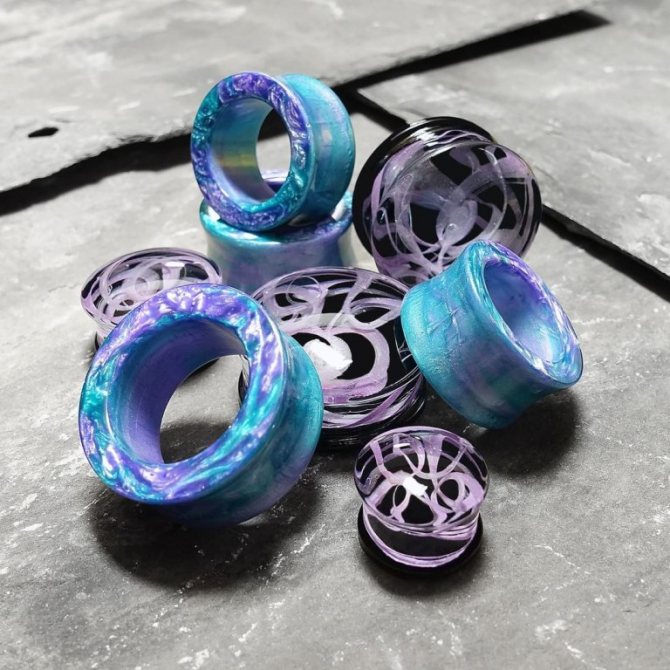 При желании можно приобрести как классические кольца, так и более оригинальные украшения из различных материалов. Но для первого прокола не рекомендуется использовать пластиковые или деревянные растяжки тоннели. Лучше всего выбирать украшения из титана — они безопасны и абсолютно гипоаллергенны.