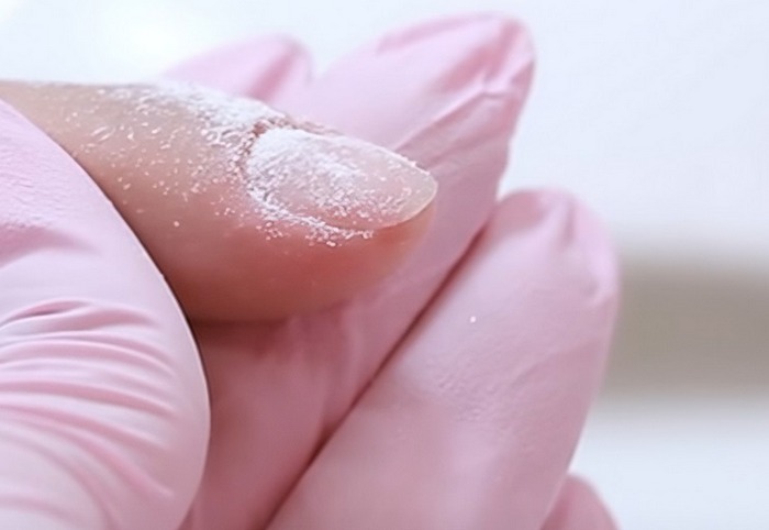 Пыль на ногтях после шлифовки — частая причина отслоения покрытия.