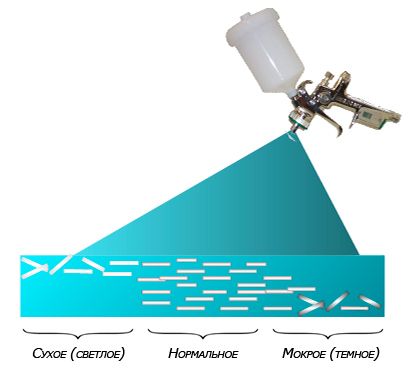То же самое происходит, если маляр в процессе нанесения наклоняет пистолет или описывает им дугу. Опять же, в одной части окрасочного факела расстояние до поверхности получается больше (эмаль ложится тоньше), в другом — меньше (эмаль ложится толще). Как результат — зерна ориентируются неравномерно и возникает дисбаланс отражения света.