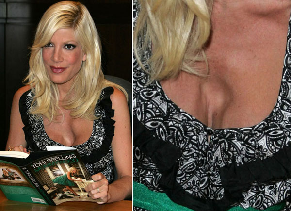 Поддавшись моде и увеличив себе размер груди, Тори совершила огромную ошибку. То ли врач оказался криворуким, то ли импланты не слишком качественными, то ли грудная клетка Тори вообще не предназначена для операций подобного рода, но результат вы видите сами. Чем глубже проваливается грудь, тем более откровенное декольте надевает Спеллинг. На наш взгляд, это больше похоже на нездоровый мазохизм, чем на любовь к себе. Любая другая на ее месте побежала бы к хирургу и вытащила силикон. Тем более, то на протяжении нескольких лет Тори непрерывно ходит беременной и в этом году ждет появление уже четвертого ребенка.