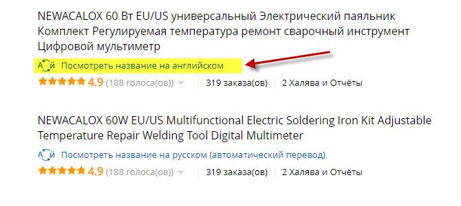 Ищите на английском языке, потому что поиск по-русски реализован на торговой площадке с использованием машинного перевода. Соответственно, поиск по Алиэкспресс выдает более релевантные результаты на англоязычные поисковые запросы. Если вдруг вы не знаете, как вещь корректно называется по-английски, то просто кликните ссылку «Посмотреть название на английском» под названием товара: