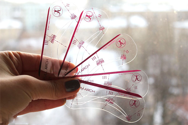 Для создания приспособления необходимы шаблоны, которые имеют разный изгиб, длину и ширину. Такое разнообразие необходимо, чтобы девушка с любой формой могла найти «тот самый» трафарет для себя.